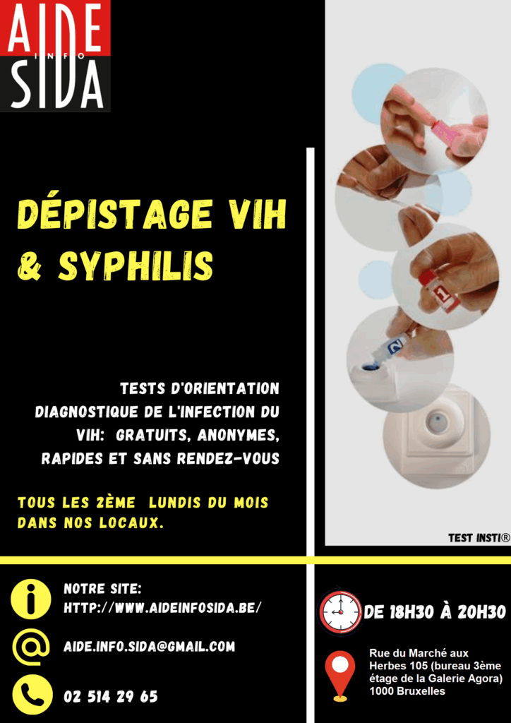 Nous organisons, les 2ème lundis du mois de 18h30 à 20h30, des séances de dépistage démédicalisé  du VIH + syphilis.